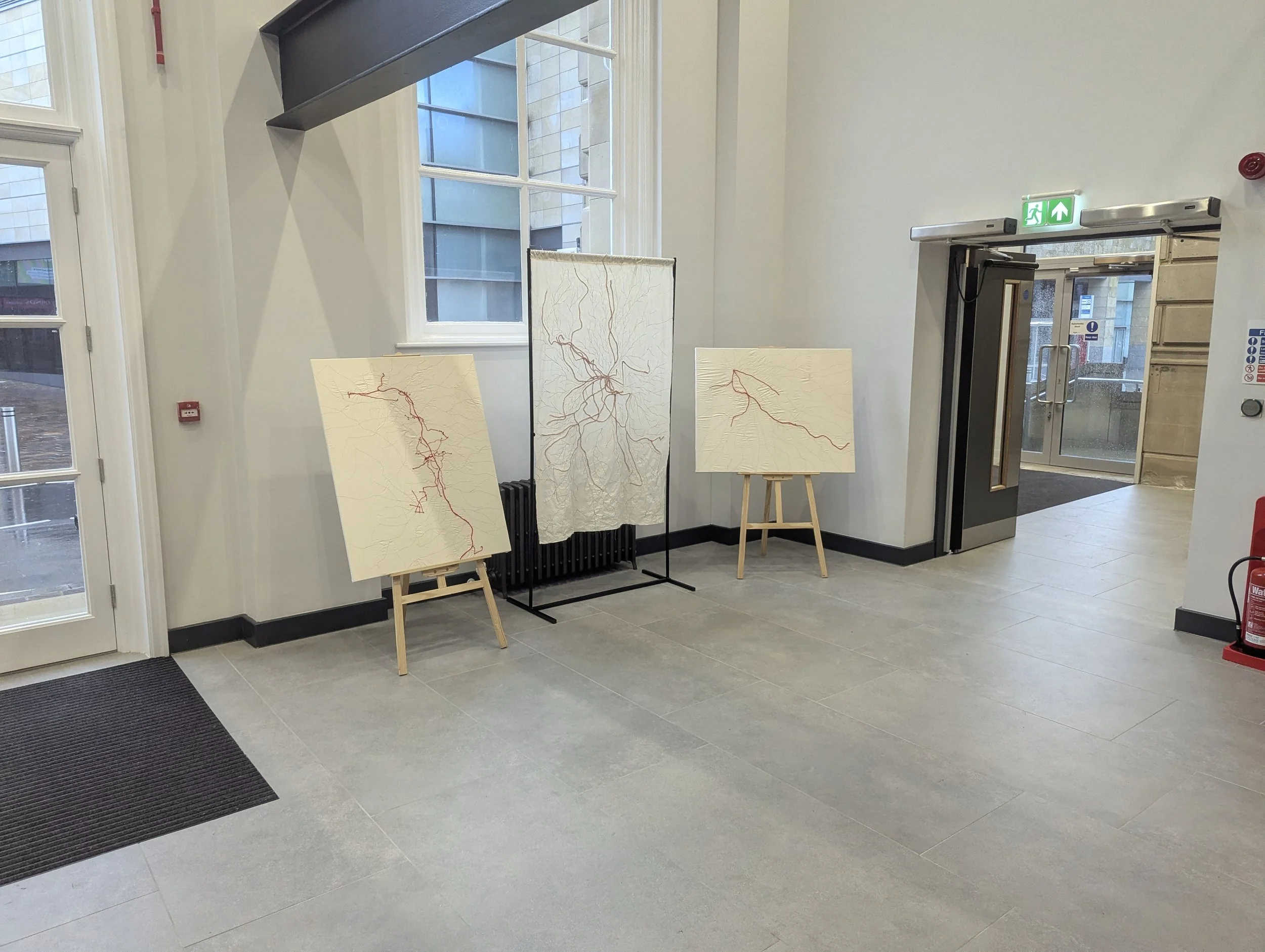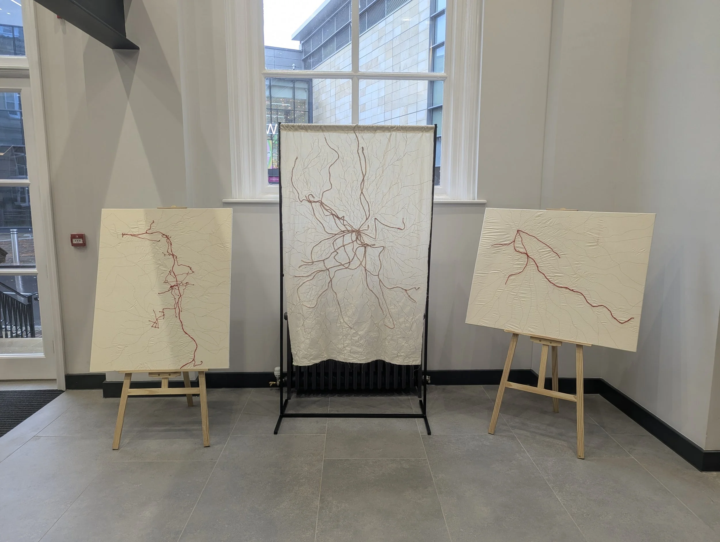 Drawing on recent research into her genealogy, ‘But where are you REALLY from?' traces migration routes and family histories through stitched, root-like patterns mapped onto fabric.